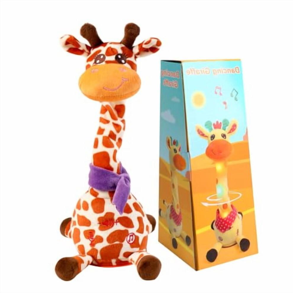 The DISEN dancing giraffe plush baby toy offers a variety of engaging functions,including volume adjustment,recording,repeating,dancing,and singing.It twists its neck with light effects,creating an interactive experience as it shares music and ""conversation"" with children.Users can record their own voices,making it a personalized gift option.Crafted from knitted plush material,it is soft,comfortable,and safe for babies,with an embroidered button pattern on the base that is secure and not easily detached.Cleaning is simple by wiping dust off with a damp cloth.To use,install 3 AA batteries (not included) by removing the bottom screws with a screwdriver,then tighten the screws.The bottom black button turns it on; pressing the label button on the giraffe starts singing,and repeated presses switch songs.After a song pauses,it can record speech.This toy repeats what is said,dances to sounds,stimulates curiosity,cultivates language communication skills,and exercises imagination.Suitable as a home or holiday decor,it also makes a fun gift for birthdays,Halloween,Thanksgiving,and Christmas. Product Feature 【Multi Functionality】Includes volume adjustment,recording,repeating,dancing,and singing functions for versatile interactive play 【Interactive Design】Twists its neck with light effects to enhance the joy of music and conversation with children 【Voice Recording】Allows users to record their own voice,enabling personalized gifting for friends and babies 【Soft and Safe Material】Made of knitted plush that is soft,comfortable,and safe for babies to play with