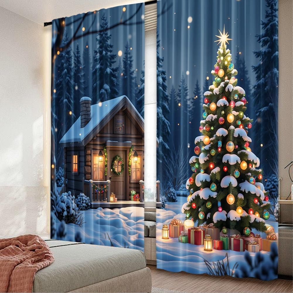 Set Of 2 Flat Printing Christmas Curtains Holiday House Scene Scopic Stylish Polyester Fiber Party Curtain Made