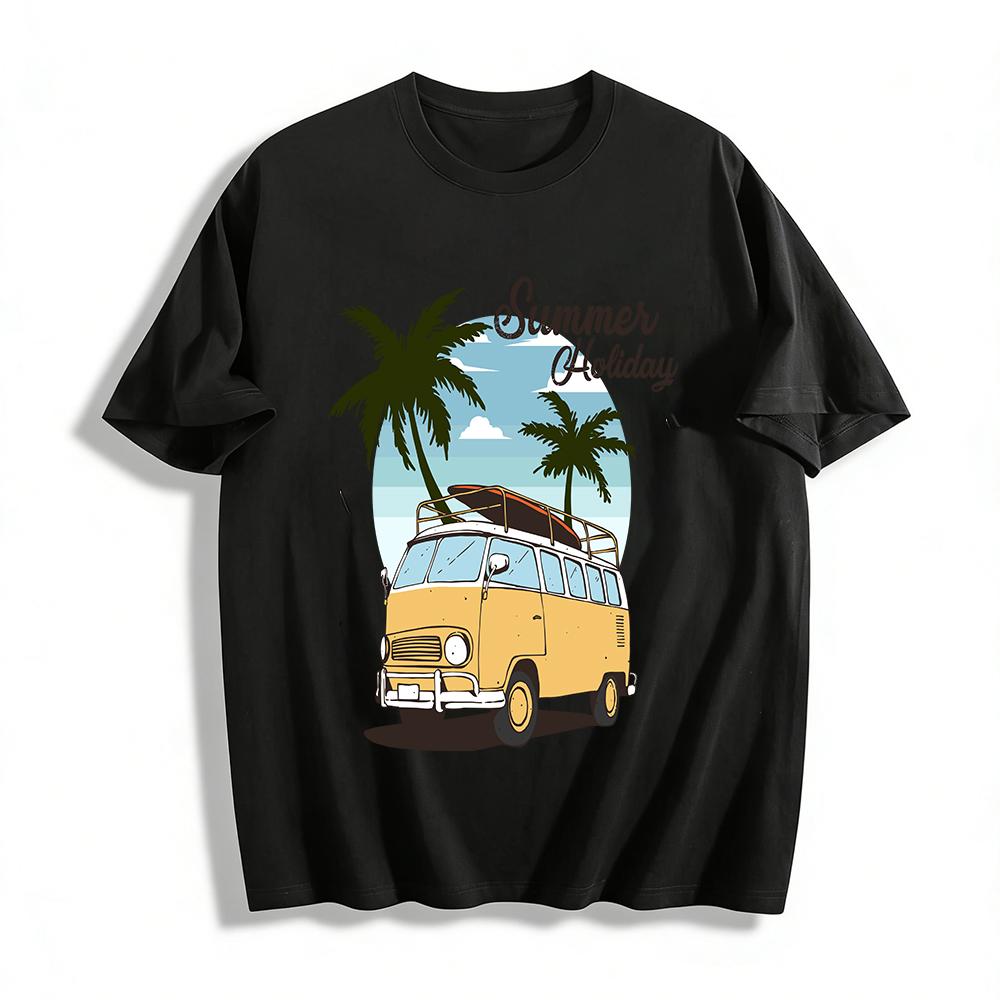 Vintage Summer Holiday Surf Bus Coconut Tree Print Casual Tee Pure Cotton T-shirt