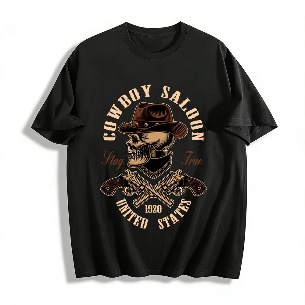 Vintage Western Cowboy Saloon Skull Print Casual Top USA 1920 Pure Cotton T-shirt