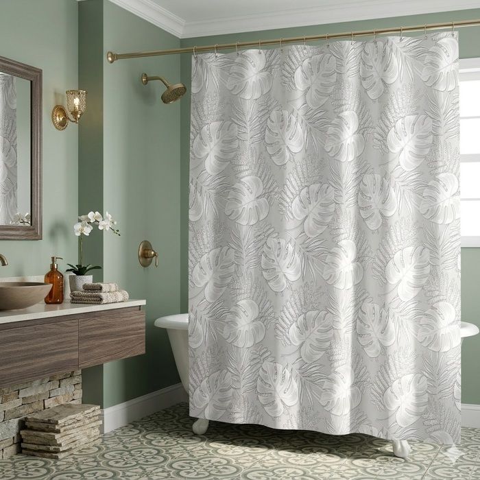 Rideau de douche - EDEN - Feuillage - Gris - 100% polyester - 180 x 200 cm