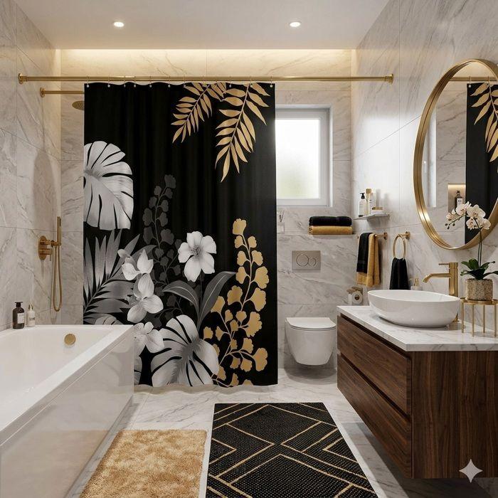 Rideau de douche - EDEN - Motif feuillage - 180 x 200 cm - 100% polyester - Noir, argenté et doré