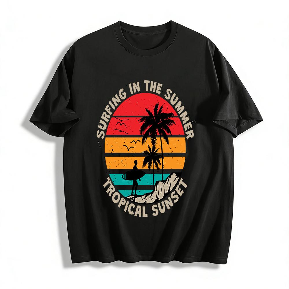 Summer Tropical Sunset Surfing Graphic Casual Tee Pure Cotton T-shirt