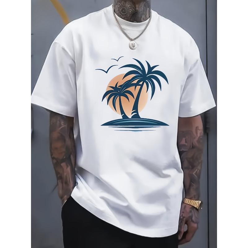 Men'S Short Sleeve T-Shirt with Vibrant Coconut Tree Print | Breathable Round Neck Casual Tee for Summer, Outdoor and Casual Attire