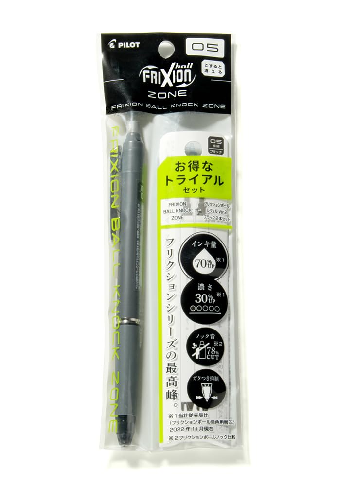 The PILOT Frixion Ball Knock Zone 0.5mm is the pinnacle of innovative erasable ballpoint pens. This trial set includes the pen body and refills, allowing you to fully experience the superior functionality of the Frixion series. Using a special ink, the written text can be cleanly erased by rubbing it with the included eraser, which generates friction heat that turns the ink colorless and transparent. Its retractable design allows for easy one-handed operation, making it ideal for business, studying, and everyday use. The 0.5mm fine tip provides a smooth writing experience perfect for diaries, notebooks, and documents. It's invaluable for brainstorming and note-taking, allowing you to freely develop your thoughts without worrying about mistakes. Combining sophisticated design with practicality, this pen will be a reliable partner in improving your work and study efficiency. Take this opportunity to experience the convenience of an erasable ballpoint pen.
