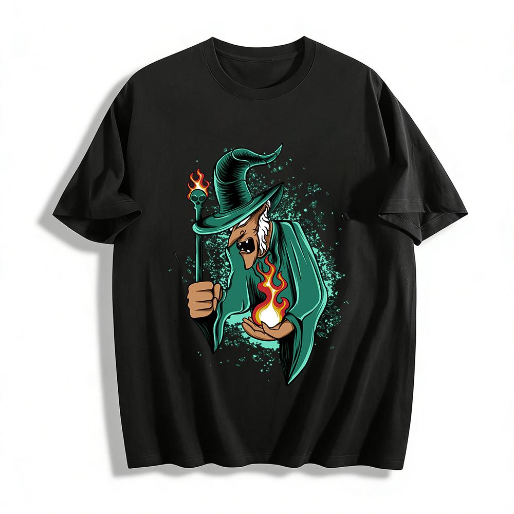 Vintage Flame Wizard Print T-shirt Trendy Dark Magic Style Top Pure Cotton T-shirt