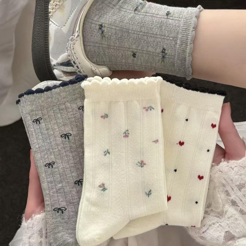 Floral White Socks - Breathable Mid-calf Socks Suitable for Spring and Autumn, Cute Frilly Socks with Multiple Layers, Summer Lightweight Long Socks