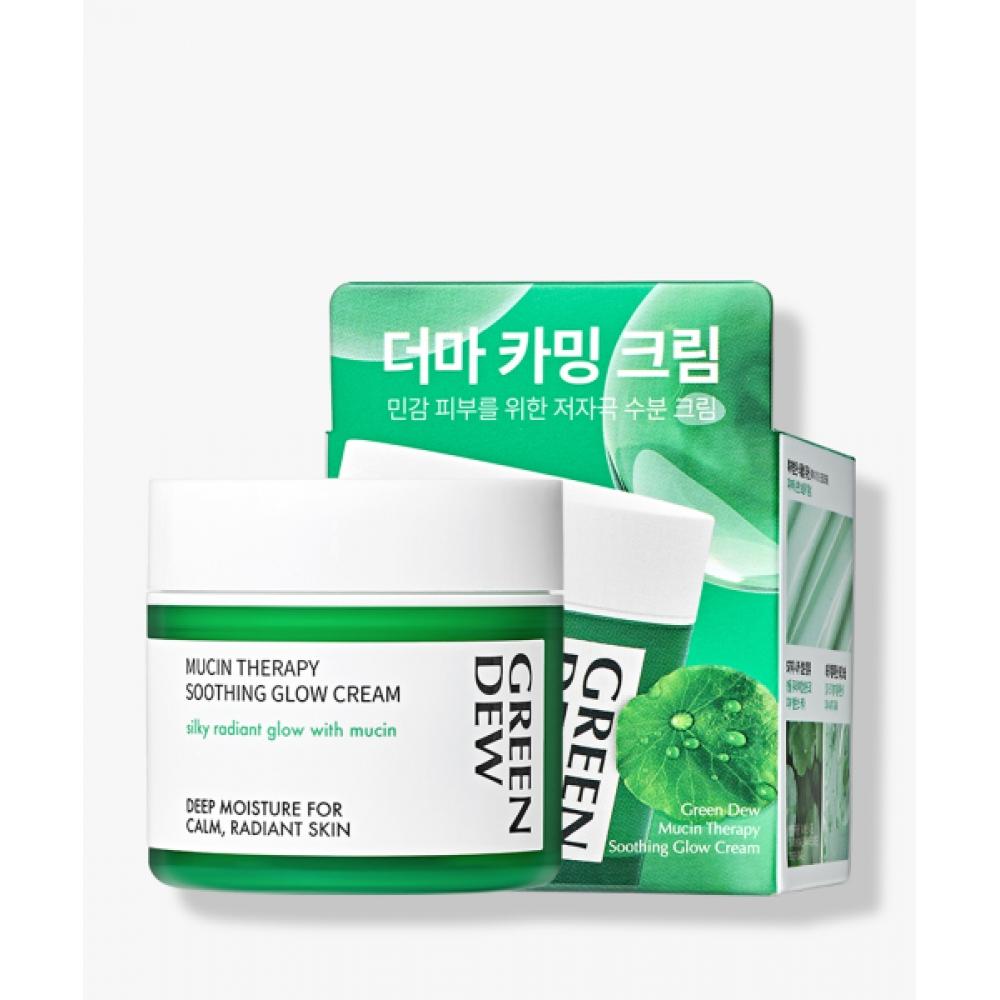ELENSILIA Green Dew Mucin Therapy Soothing Glow Cream 50ml is a soothing moisturizer based on plant-derived mucin suitable for all skin types. This cream minimizes irritation considering sensitive skin, reinforcing the skin barrier and providing a dewy glow through the effects of mucin. With a light texture, it absorbs quickly without leaving stickiness. It is suitable for daily use, especially for dry or irritated skin.