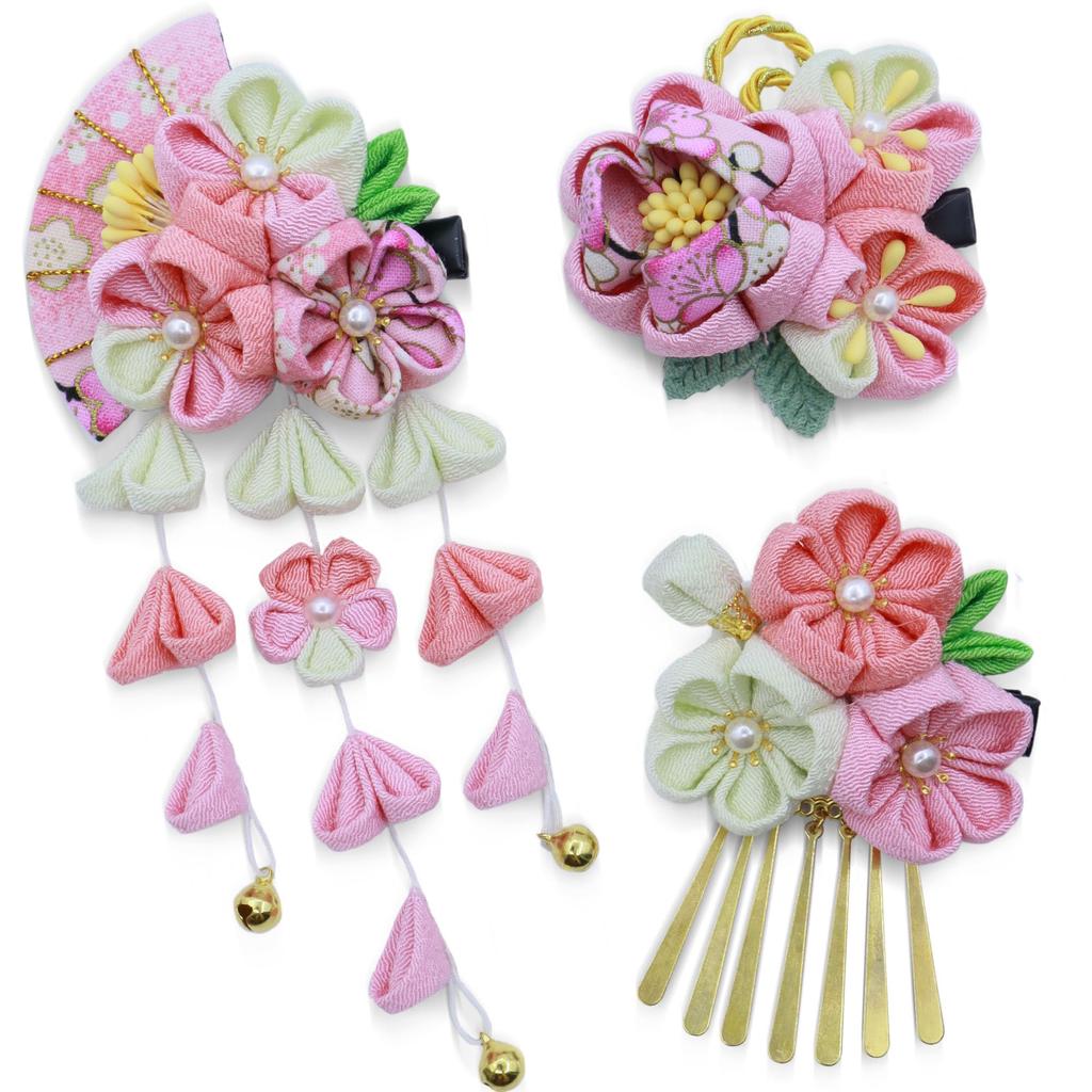 [JZOON Hair Accessories] 3-Piece Set for Shichi-Go-San (7-5-3 Festival), Tsumami-zaiku (traditional Japanese Fabric Flower Making), for Coming-of-Age